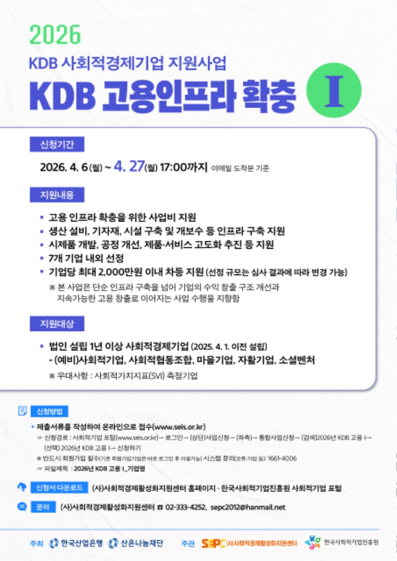 [공고](~4/27까지)2026년 KDB 사회적경제기업 지원사업 『고용인프라 확충Ⅰ』 모집 안내 관리자 0 14 04.07 16:38 2026.04.07 16:38 [공고문] 2026년 KDB 사회적경제기업 지원사업_고용인프라 I.hwp (231.5K) + 4 2026.04.07 16:38 [서식 1, 2] 신청서 및 사업계획서_KDB 고용I_기업명.hwp (66.0K) + 4 2026.04.07 16:38 [서식 3] 정보입력표_KDB 고용I_기업명.xlsx (13.3K) + 5 ▶ 지원대상: 설립 1년 이상 사회적경제기업(사회적기업·협동조합 등) ▶ 지원내용: 설비·기자재·시설개보수 등 고용 인프라 구축 지원 ※ 기업당 최대 2,000만원 지원 / 약 7개 기업 선정 ▶ 접수기간: 2026.4.6.(월) ~ 4.27.(월) 17:00까지 ▶ 신청방법: 사회적기업 포털(온라인 접수) ▶ 심사절차: 서류·현장·면접 등 단계별 평가 진행 ※ SVI 측정기업 가점 부여(최대 +10점) ☎ 02-333-4252 (사회적경제활성화지원센터)
